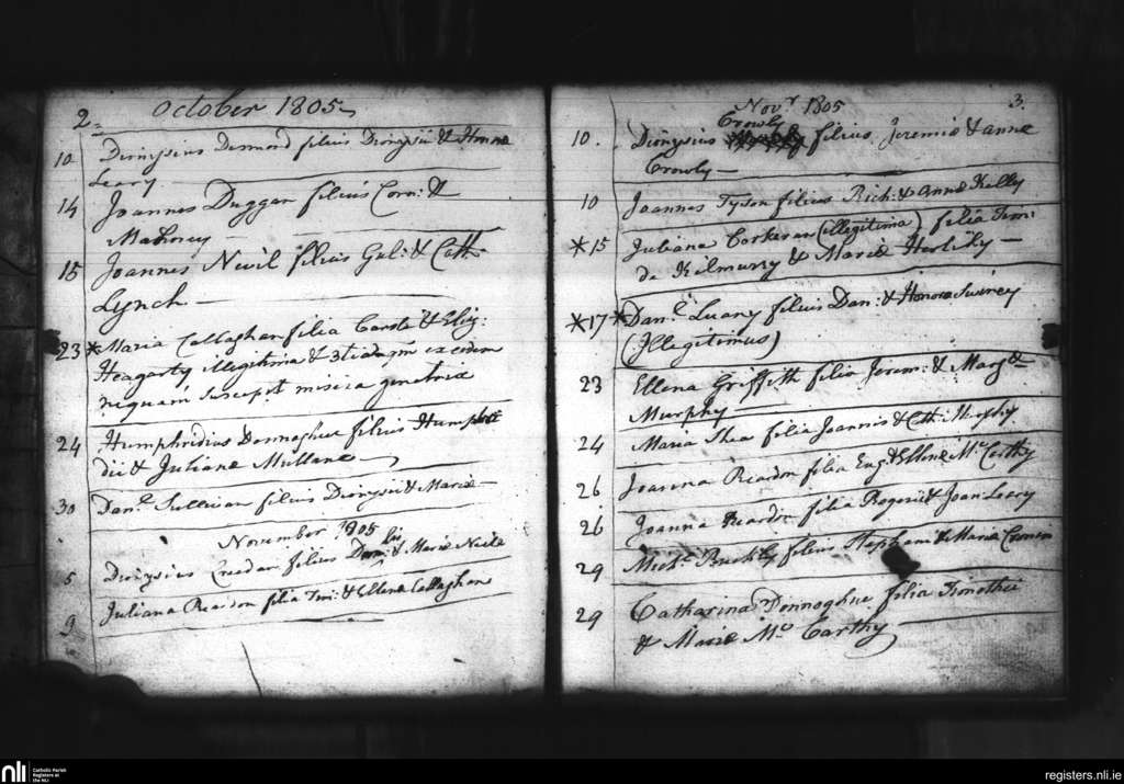 Macroom; County of Cork; Diocese of Cloyne. Baptisms, Oct. 1805 to Nov. 1805