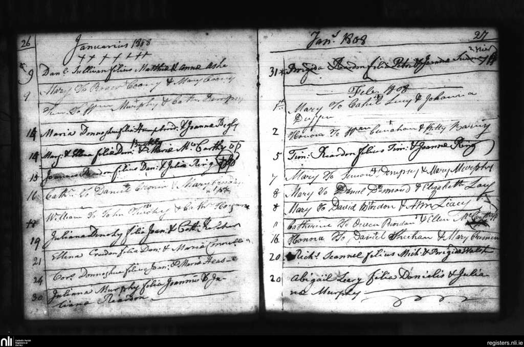 Macroom; County of Cork; Diocese of Cloyne. Baptisms, Jan. 1808 to Feb. 1808