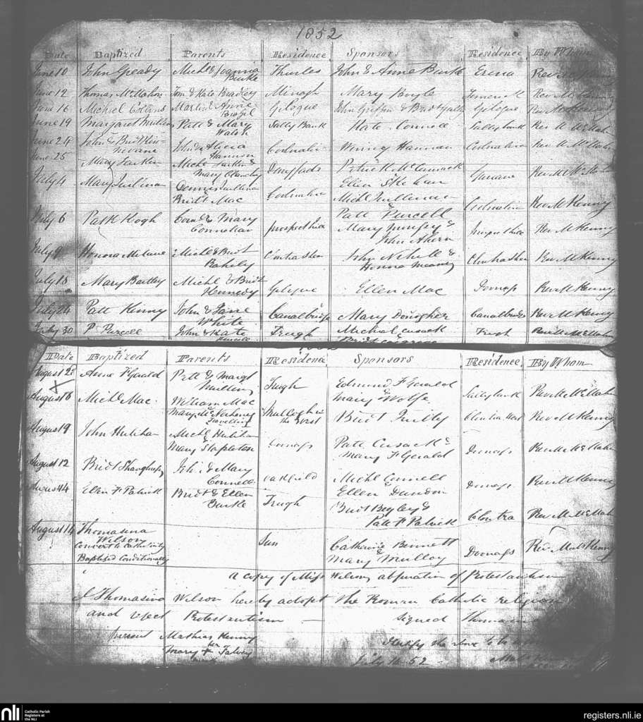 Doonass and Truagh; County of Clare; Diocese of Killaloe. Baptisms, June 1852 to Aug. 1852