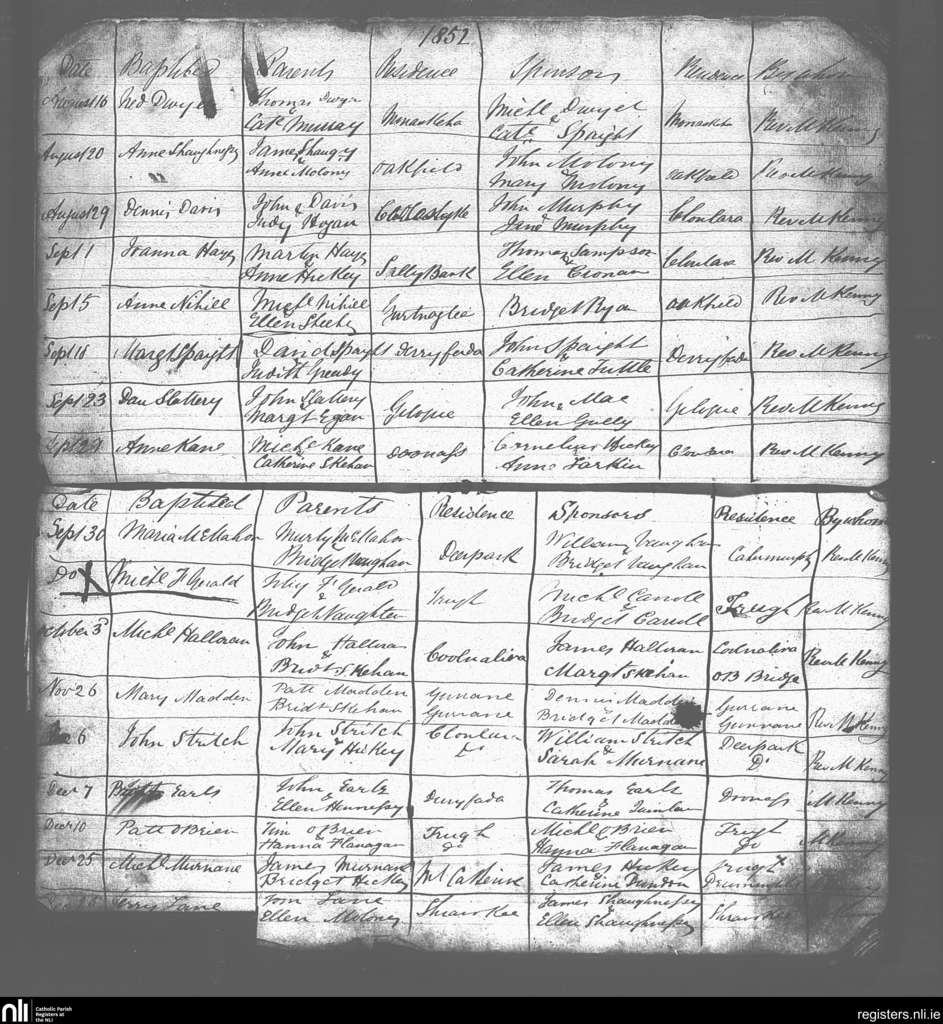 Doonass and Truagh; County of Clare; Diocese of Killaloe. Baptisms, Aug. 1852 to Dec. 1852