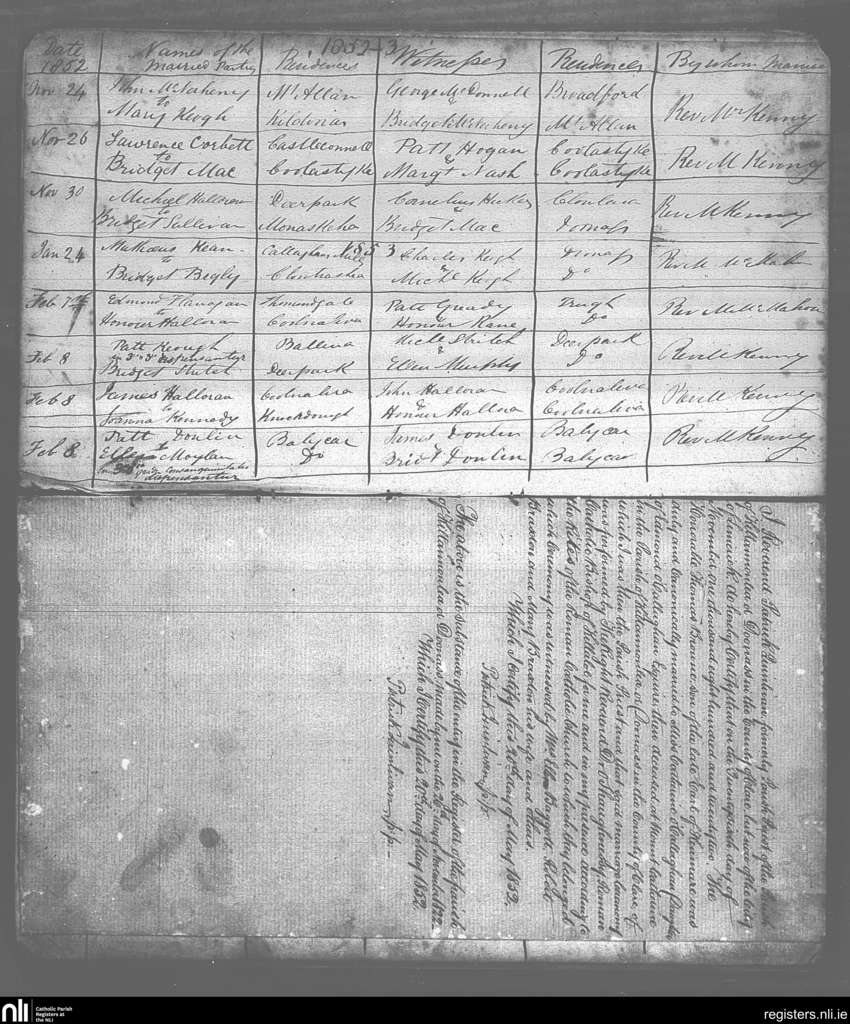 Doonass and Truagh; County of Clare; Diocese of Killaloe. Marriages, Nov. 1852 to Feb. 1853