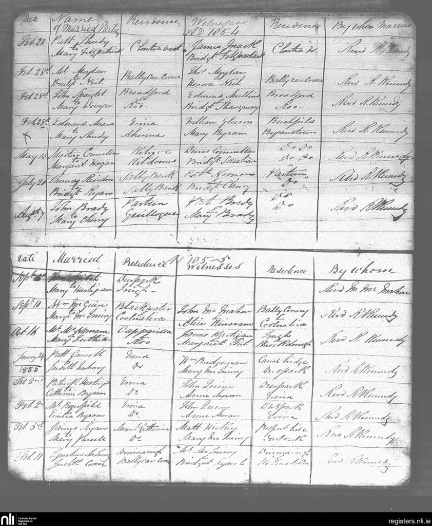 Doonass and Truagh; County of Clare; Diocese of Killaloe. Marriages, Feb. 1854 to Feb. 1855