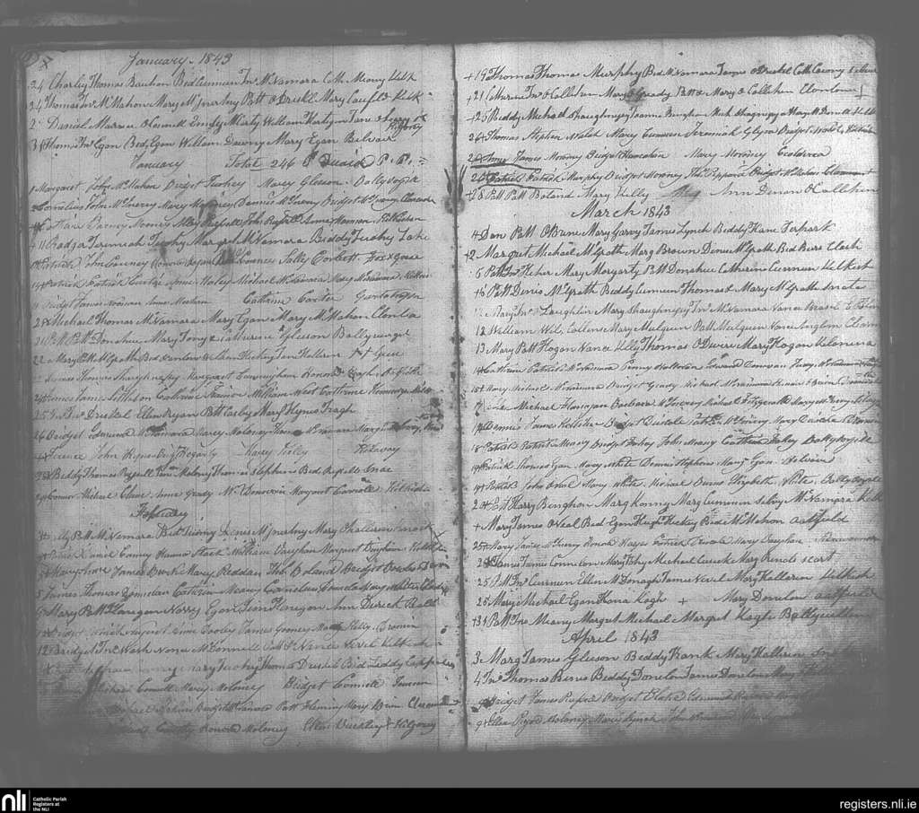 O'Callaghan's Mills; County of Clare; Diocese of Killaloe. Baptisms, Jan. 1843 to Apr. 1843