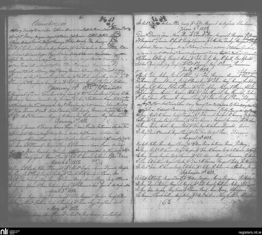O'Callaghan's Mills; County of Clare; Diocese of Killaloe. Baptisms, Dec. 1851 to Sep. 1852