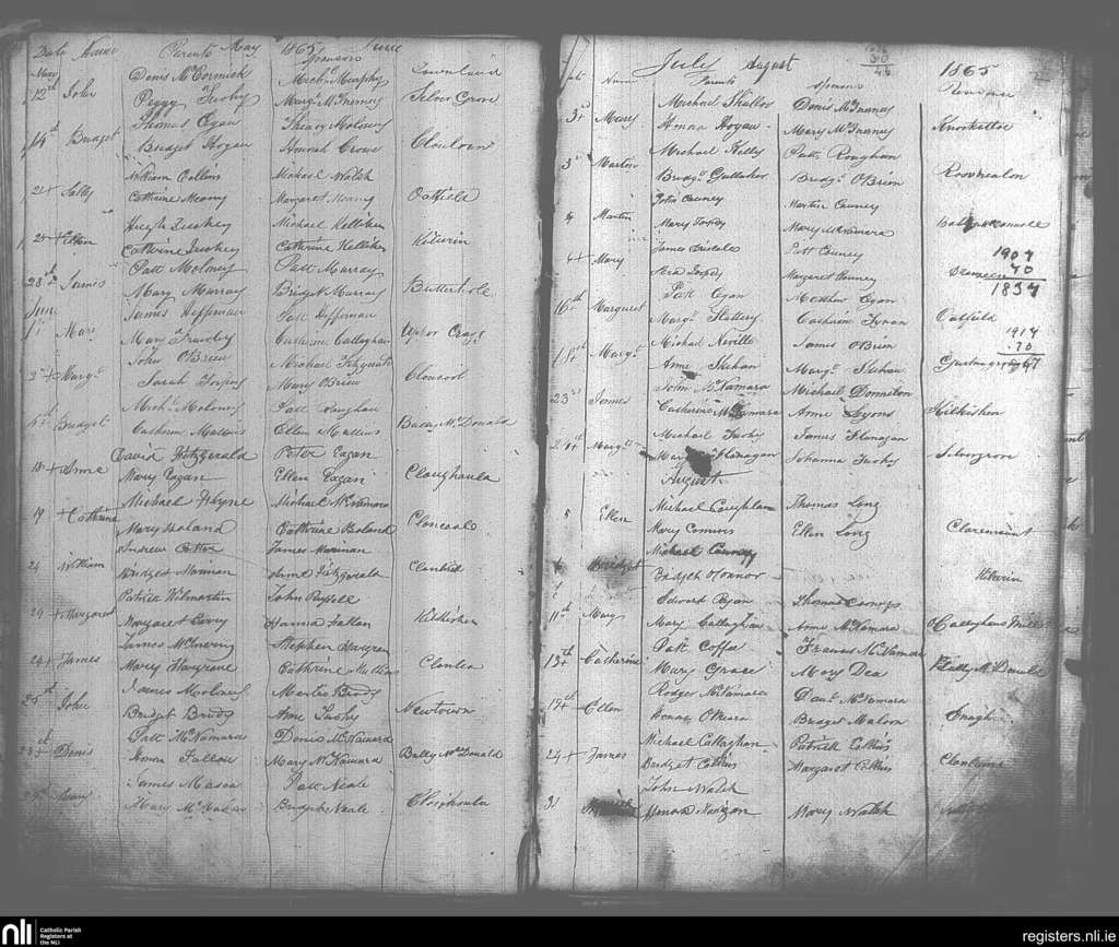 O'Callaghan's Mills; County of Clare; Diocese of Killaloe. Baptisms, May 1865 to Aug. 1865
