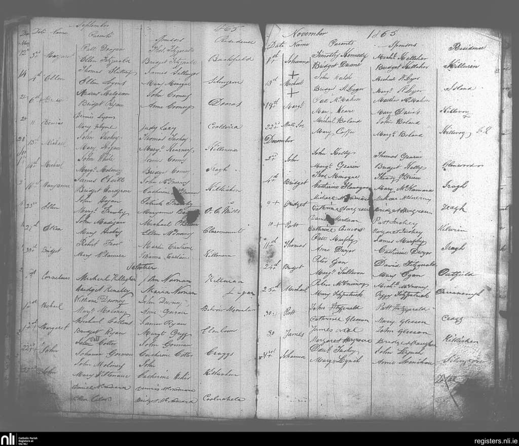 O'Callaghan's Mills; County of Clare; Diocese of Killaloe. Baptisms, Sep. 1865 to Dec. 1865