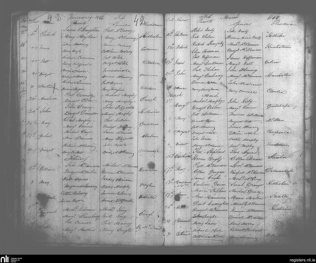 O'Callaghan's Mills; County of Clare; Diocese of Killaloe. Baptisms, Jan. 1866 to Mar. 1866