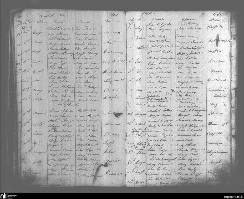 O'Callaghan's Mills; County of Clare; Diocese of Killaloe. Baptisms, Marriages, Aug. 1866 to June 1921
