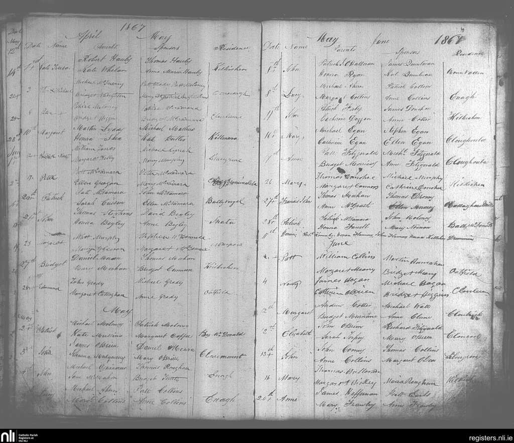 O'Callaghan's Mills; County of Clare; Diocese of Killaloe. Baptisms, Apr. 1867 to June 1867