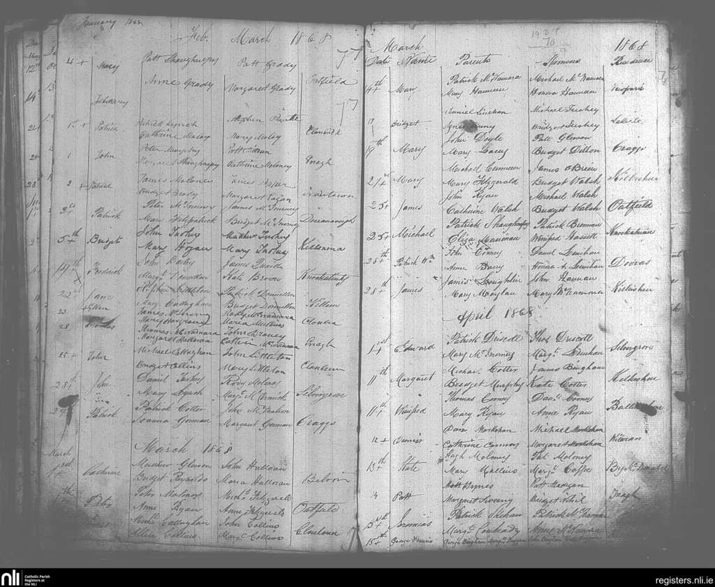 O'Callaghan's Mills; County of Clare; Diocese of Killaloe. Baptisms, Jan. 1868 to Apr. 1868