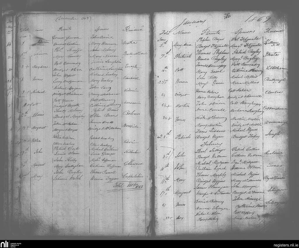 O'Callaghan's Mills; County of Clare; Diocese of Killaloe. Baptisms, Dec. 1868 to Feb. 1869