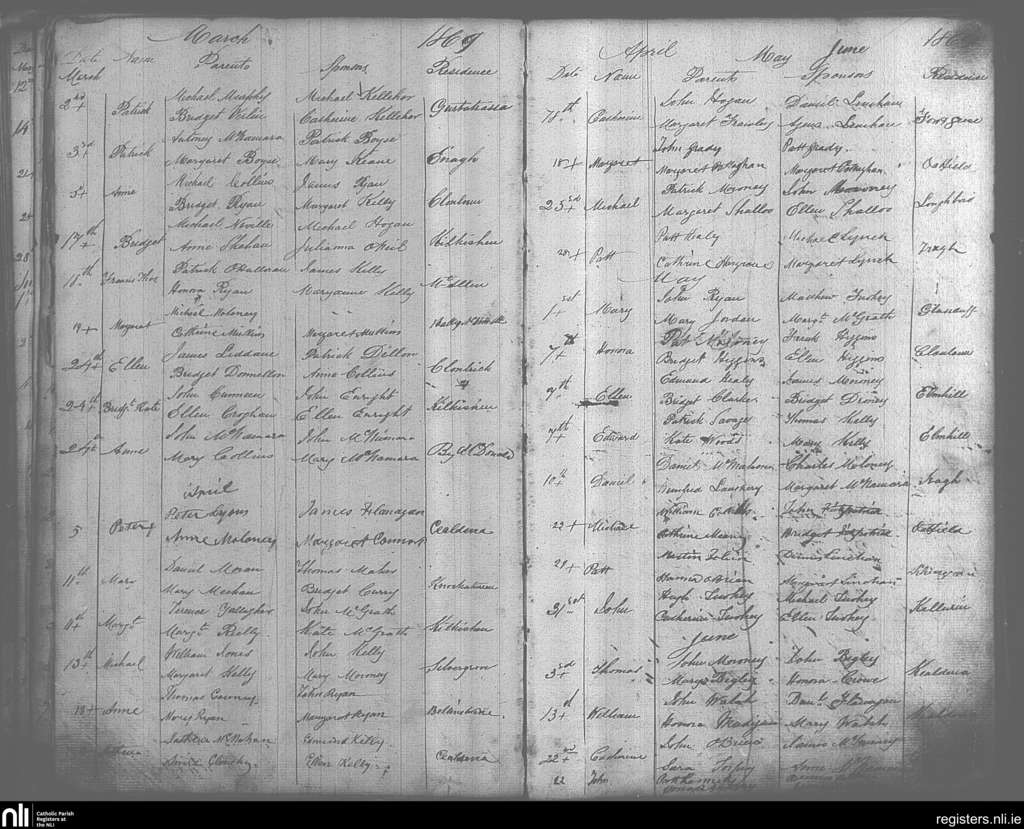 O'Callaghan's Mills; County of Clare; Diocese of Killaloe. Baptisms, Mar. 1869 to June 1869