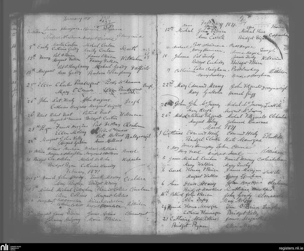 O'Callaghan's Mills; County of Clare; Diocese of Killaloe. Baptisms, Jan. 1871 to Mar. 1871