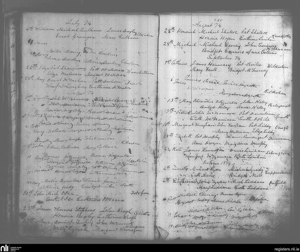 O'Callaghan's Mills; County of Clare; Diocese of Killaloe. Baptisms, July 1874 to Oct. 1874