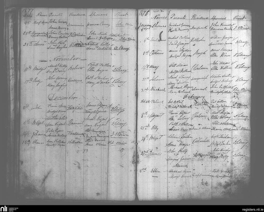 O'Callaghan's Mills; County of Clare; Diocese of Killaloe. Baptisms, Oct. 1877 to Mar. 1878