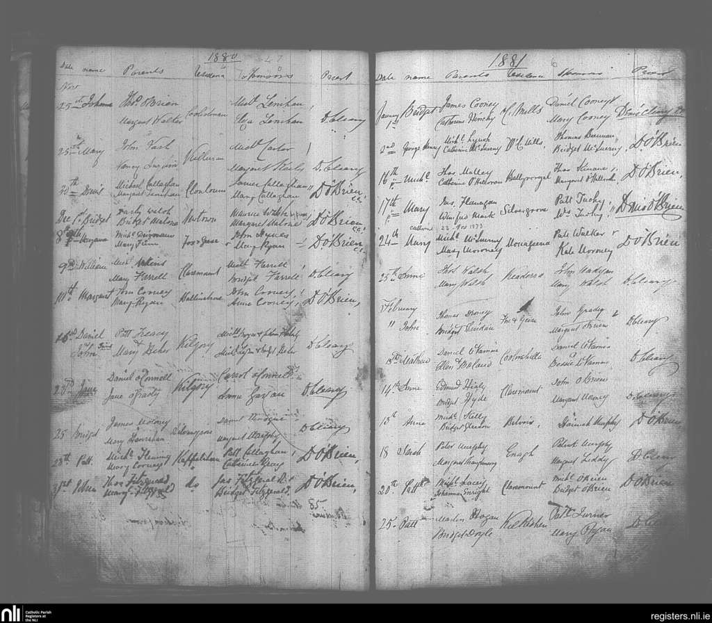 O'Callaghan's Mills; County of Clare; Diocese of Killaloe. Baptisms, Nov. 1880 to Feb. 1881