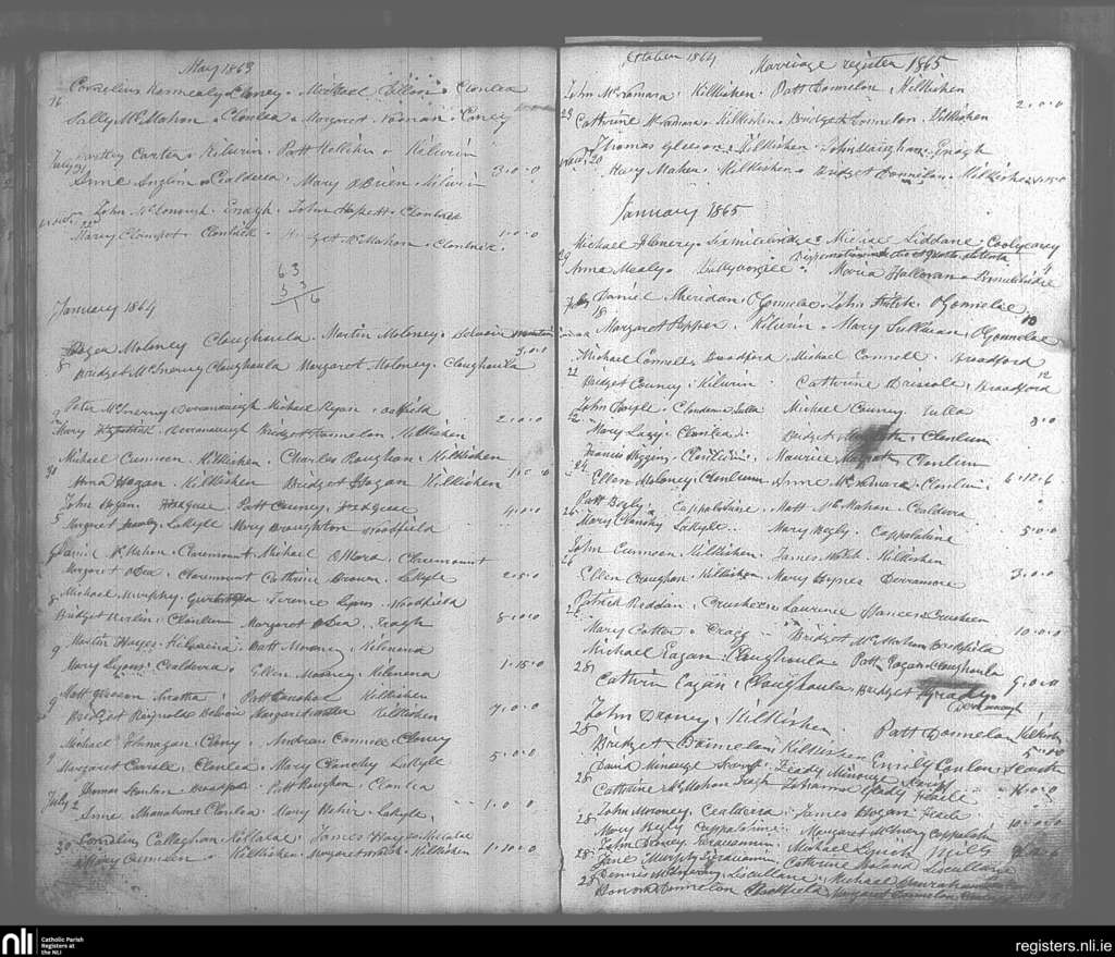 O'Callaghan's Mills; County of Clare; Diocese of Killaloe. Marriages, May 1863 to Feb. 1865