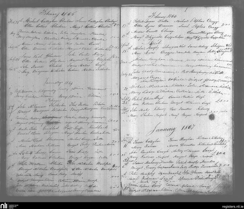 O'Callaghan's Mills; County of Clare; Diocese of Killaloe. Marriages, Feb. 1865 to Mar. 1867