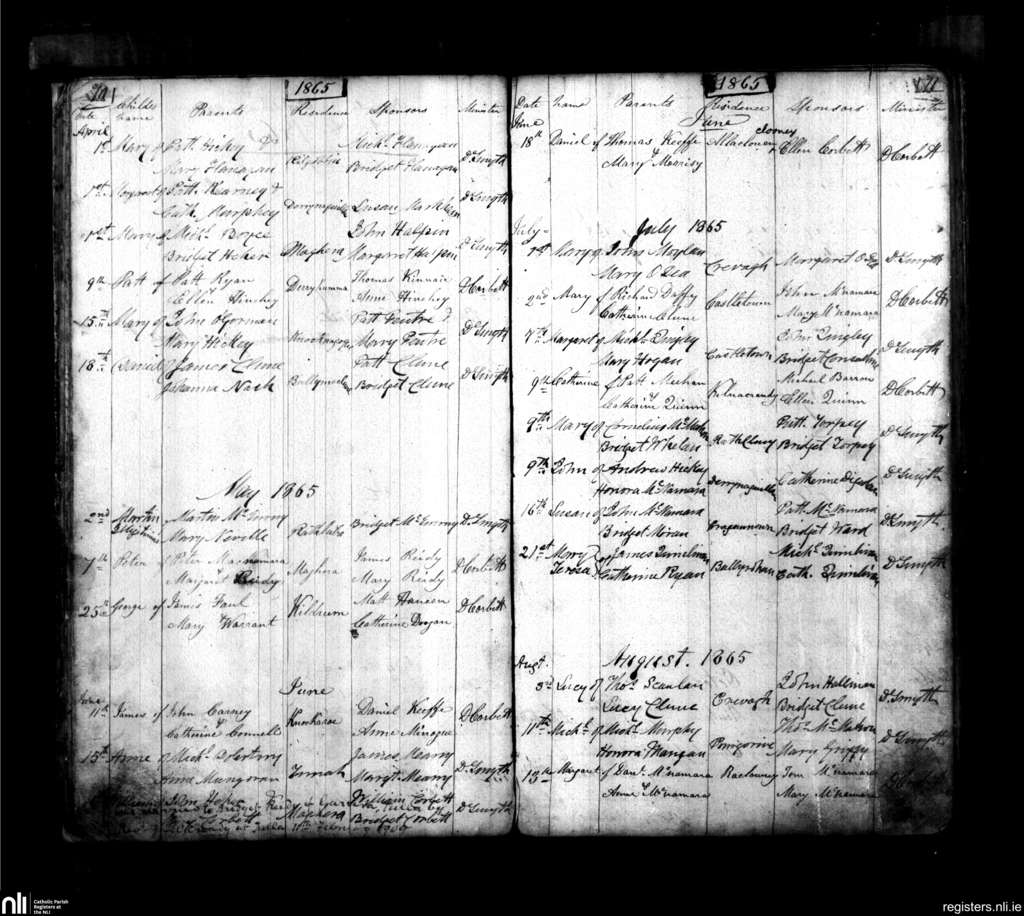 Quin; County of Clare; Diocese of Killaloe. Baptisms, Apr. 1865 to Aug. 1865