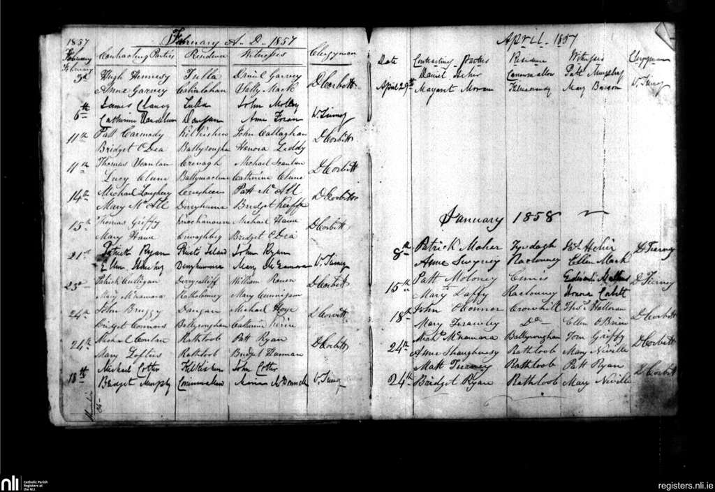 Quin; County of Clare; Diocese of Killaloe. Marriages, Feb. 1857 to Jan. 1858