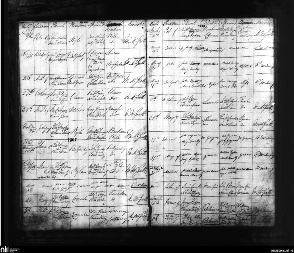 Cloughjordan; County of Tipperary; Diocese of Killaloe. Baptisms, Nov. 1866 to Apr. 1867