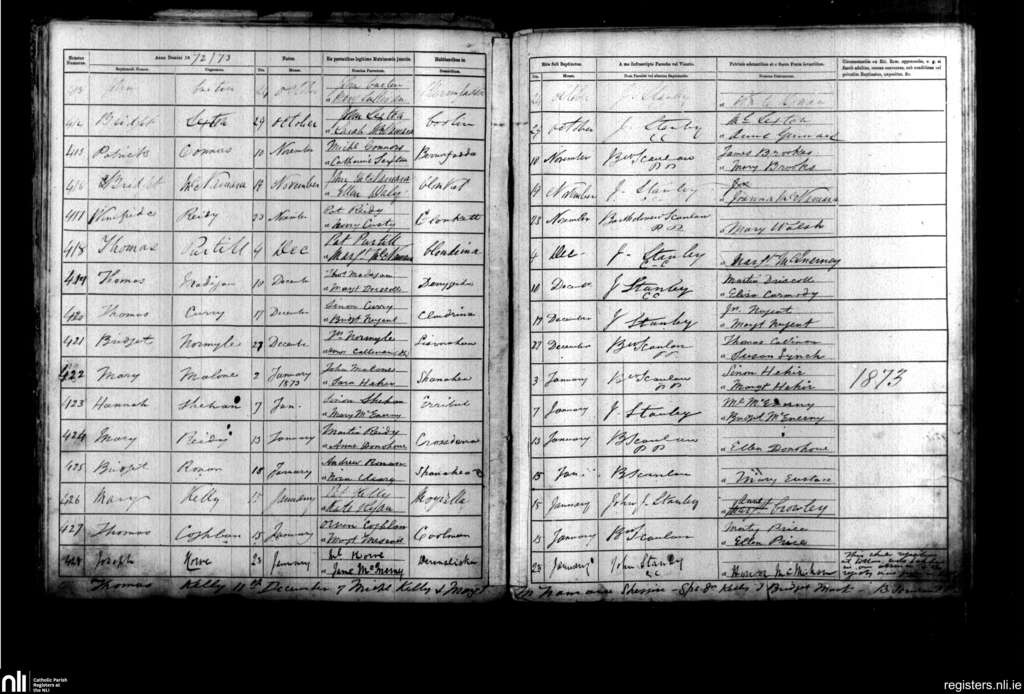 Kilfiddane; County of Clare; Diocese of Killaloe. Baptisms, Oct. 1872 to Jan. 1873