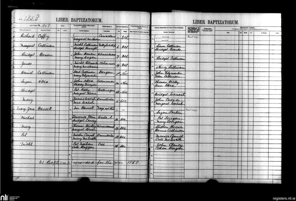 Kilmacduane; County of Clare; Diocese of Killaloe. Baptisms, Oct. 1858 to Dec. 1858