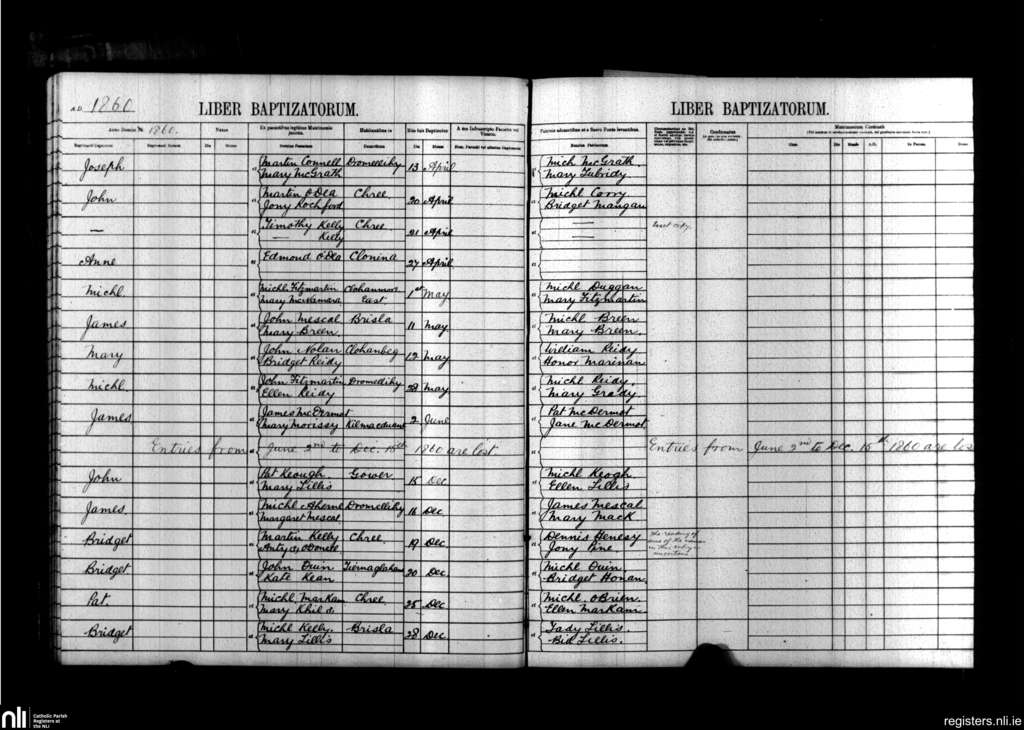 Kilmacduane; County of Clare; Diocese of Killaloe. Baptisms, Apr. 1860 to Dec. 1860