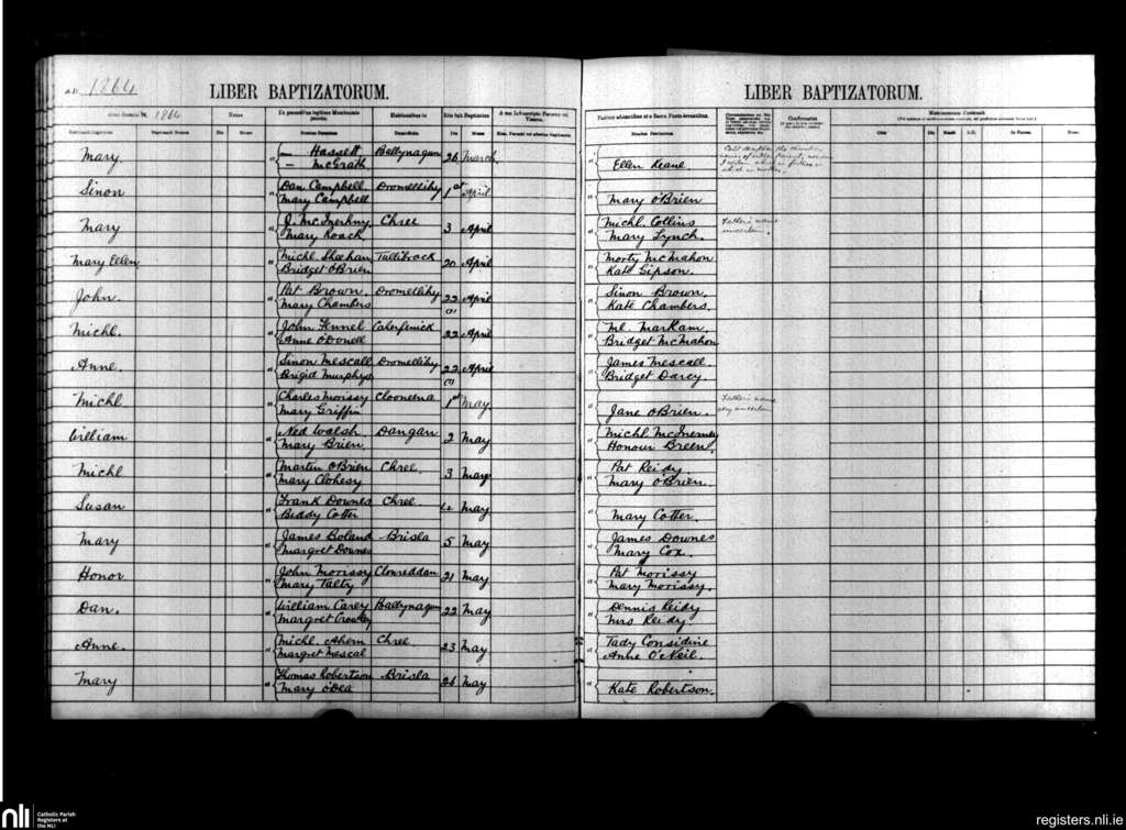 Kilmacduane; County of Clare; Diocese of Killaloe. Baptisms, Mar. 1864 to May 1864