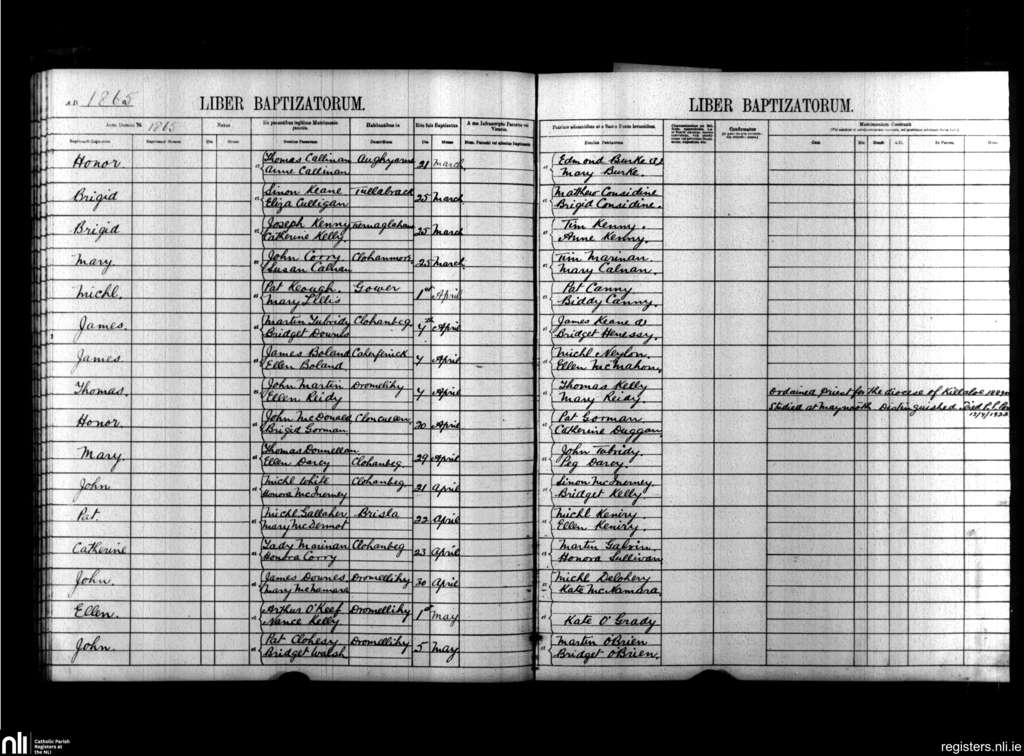 Kilmacduane; County of Clare; Diocese of Killaloe. Baptisms, Mar. 1865 to May 1865
