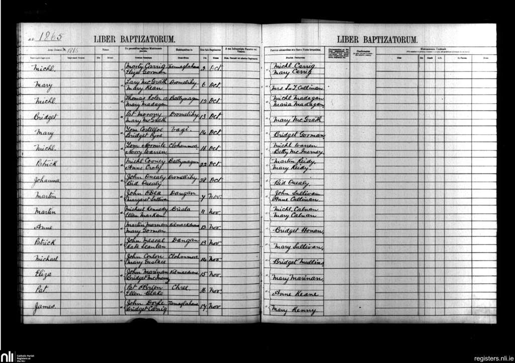 Kilmacduane; County of Clare; Diocese of Killaloe. Baptisms, Oct. 1865 to Nov. 1865