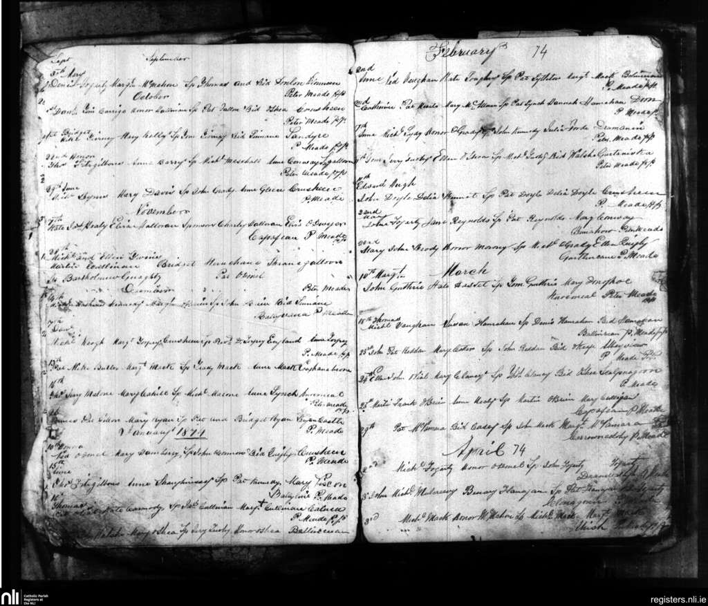Crusheen; County of Clare; Diocese of Killaloe. Baptisms, Sep. 1873 to Apr. 1874
