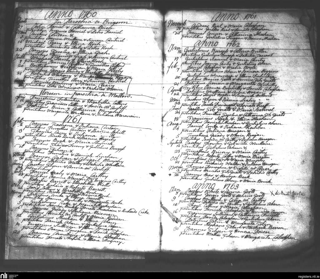 Mallow; County of Cork; Diocese of Cloyne. Marriages, Apr. 1760 to Jan. 1763