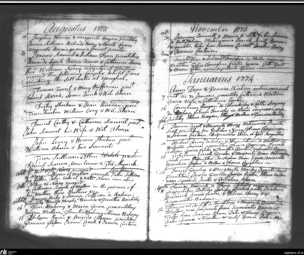 Mallow; County of Cork; Diocese of Cloyne. Marriages, Aug. 1773 to Apr. 1774