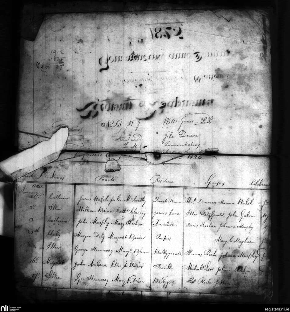 Mallow; County of Cork; Diocese of Cloyne. Baptisms, Jan. 1825