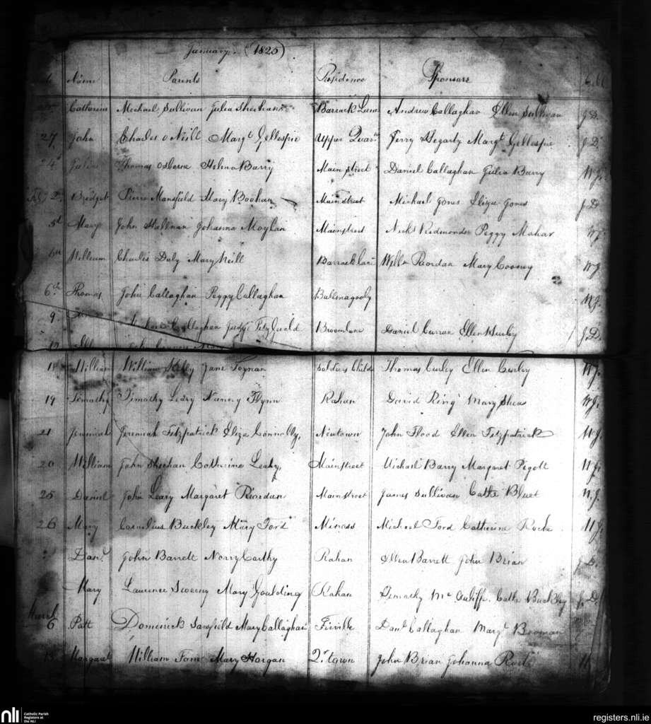 Mallow; County of Cork; Diocese of Cloyne. Baptisms, Jan. 1825 to Mar. 1825