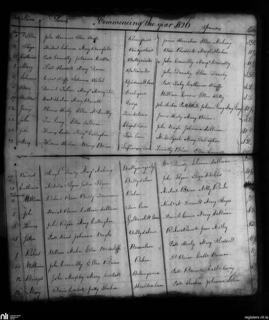 Mallow; County of Cork; Diocese of Cloyne. Baptisms, Jan. 1826 to Feb. 1826