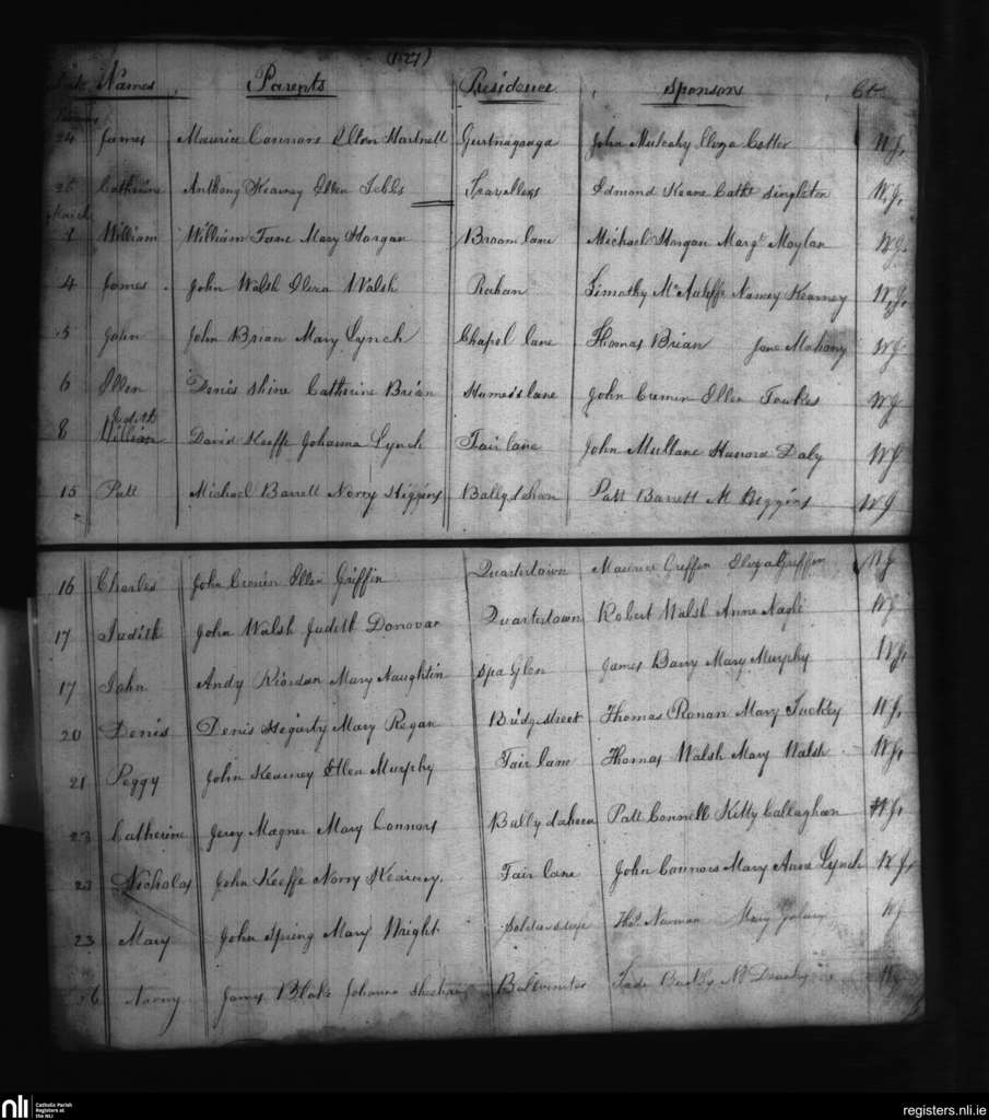 Mallow; County of Cork; Diocese of Cloyne. Baptisms, Feb. 1827 to Mar. 1827