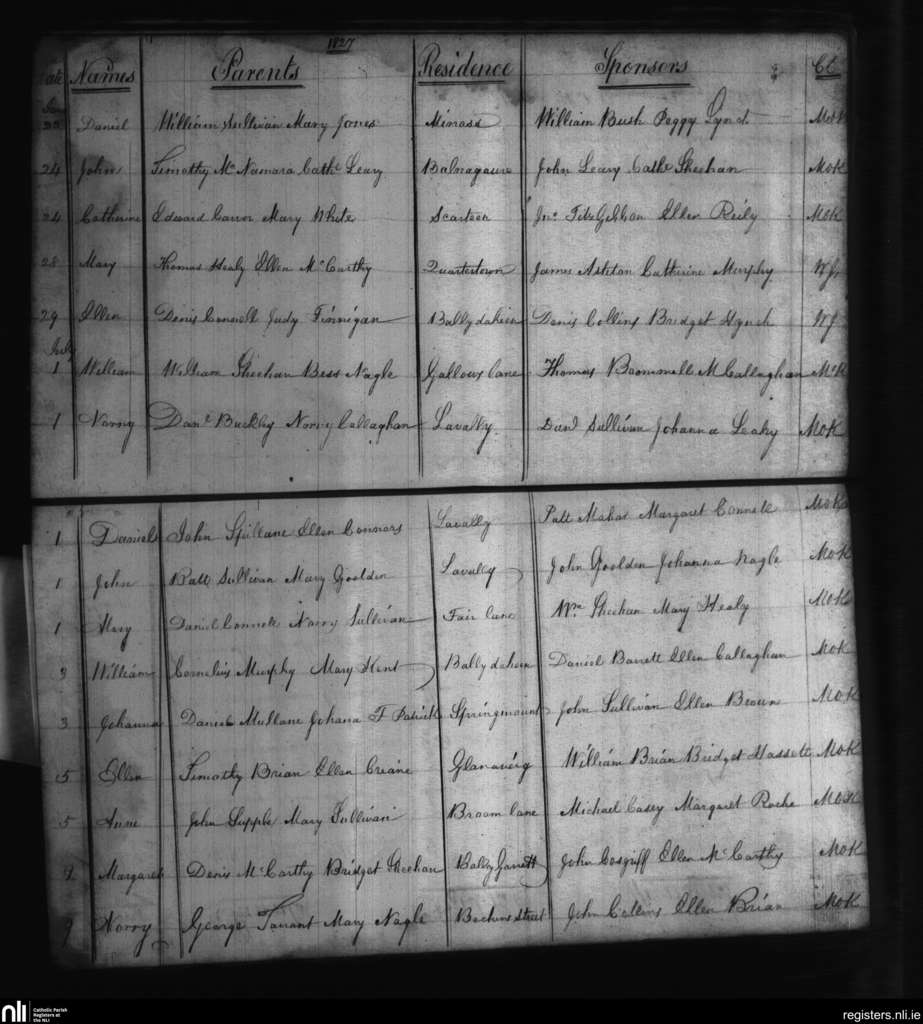 Mallow; County of Cork; Diocese of Cloyne. Baptisms, June 1827 to July 1827