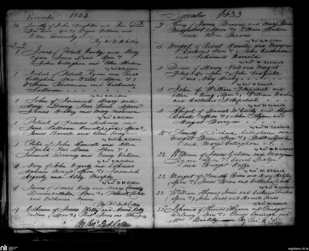 Mallow; County of Cork; Diocese of Cloyne. Baptisms, Nov. 1833 to Dec. 1833