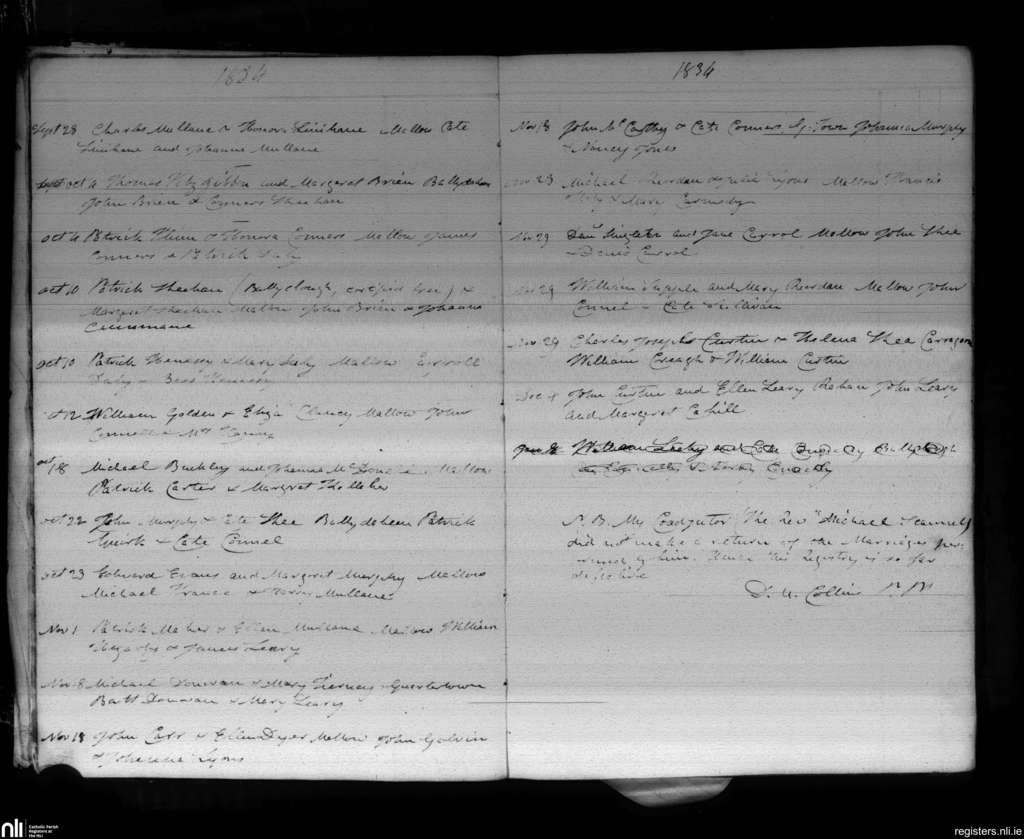 Mallow; County of Cork; Diocese of Cloyne. Marriages, Sep. 1834 to Dec. 1834