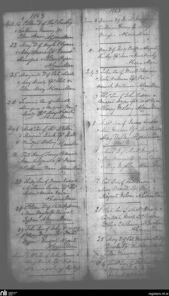 Feakle; County of Clare; Diocese of Killaloe. Baptisms, Apr. 1863 to Aug. 1863