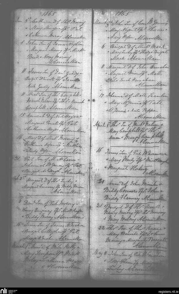 Feakle; County of Clare; Diocese of Killaloe. Baptisms, Jan. 1865 to May 1865