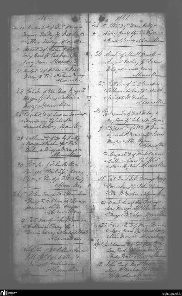 Feakle; County of Clare; Diocese of Killaloe. Baptisms, Jan. 1866 to Apr. 1866