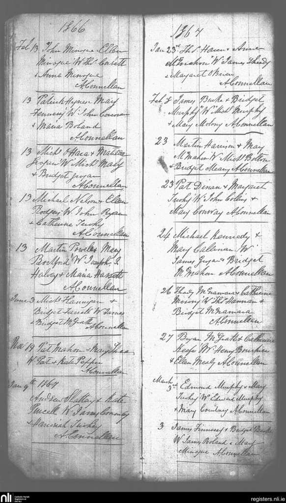 Feakle; County of Clare; Diocese of Killaloe. Marriages, Feb. 1866 to Mar. 1867