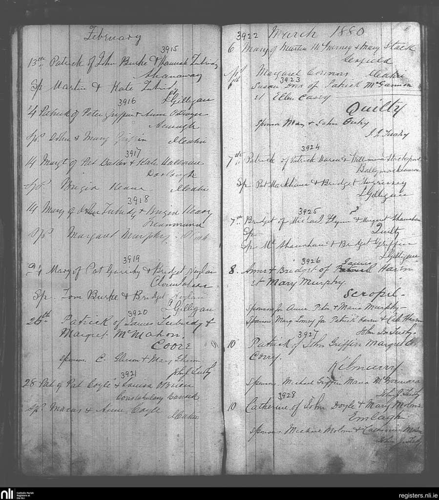 Kilmurry Ibricken; County of Clare; Diocese of Killaloe. Baptisms, Feb. 1880 to Mar. 1880