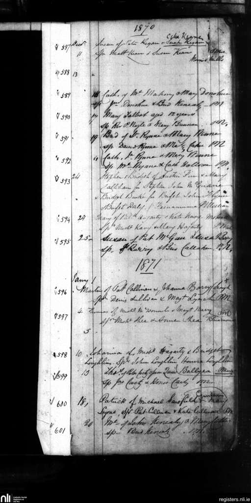 Inagh and Kilnamona; County of Clare; Diocese of Killaloe. Baptisms, Dec. 1870 to Jan. 1871