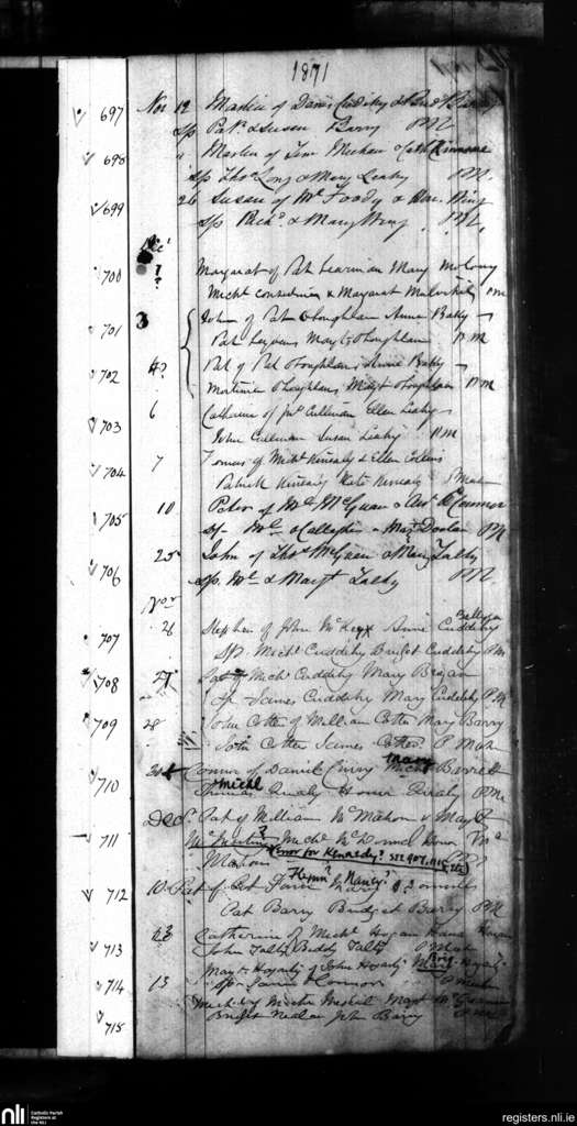Inagh and Kilnamona; County of Clare; Diocese of Killaloe. Baptisms, Nov. 1871 to Dec. 1871