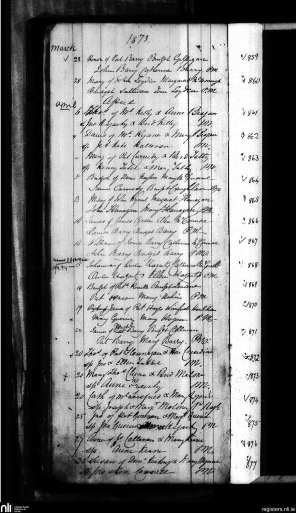 Inagh and Kilnamona; County of Clare; Diocese of Killaloe. Baptisms, Mar. 1873 to Apr. 1873