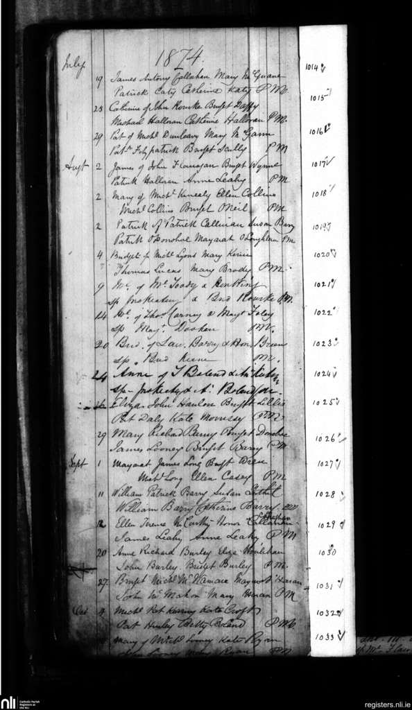 Inagh and Kilnamona; County of Clare; Diocese of Killaloe. Baptisms, July 1874 to Oct. 1874